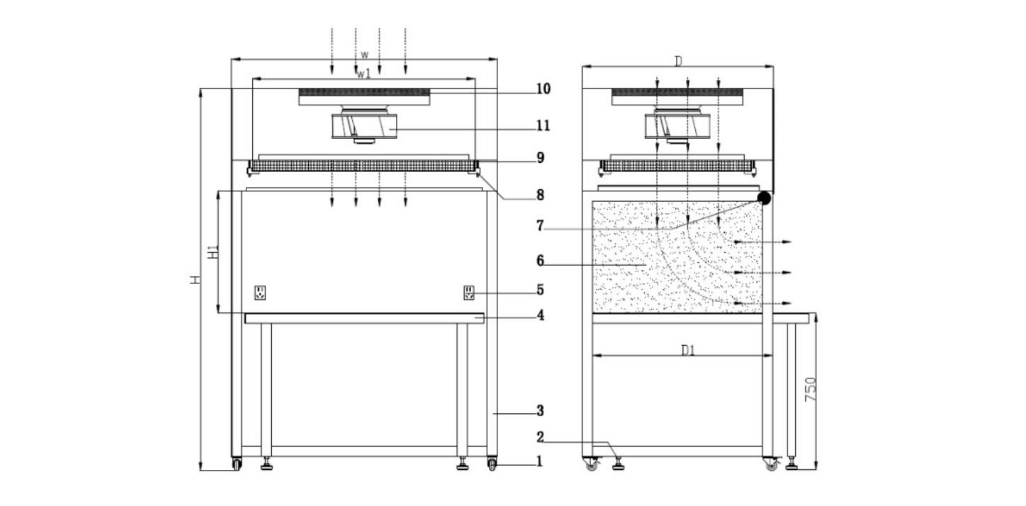 Vertical flow clean worktable description: 1.with brake casters peal foot cup 3.bracket 4.stainless steel table 5.socket 6.glass 7.fluorescent lamp 8.control switch 9.high efficiency filter 10.primary filter 11.fan